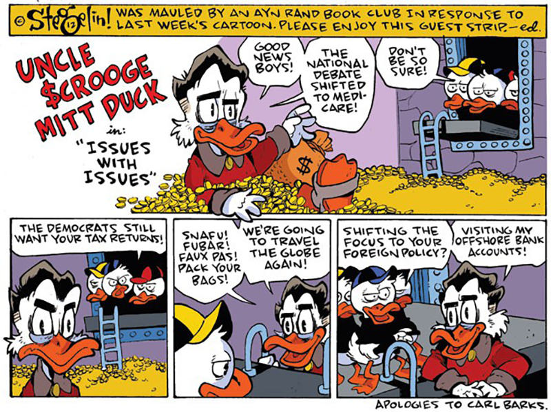 Editorial cartoon re: then-Presidential candidate Mitt Romney, originally published in Charleston City Paper. Parody (obviously) of Carl Barks' Uncle Scrooge McDuck.